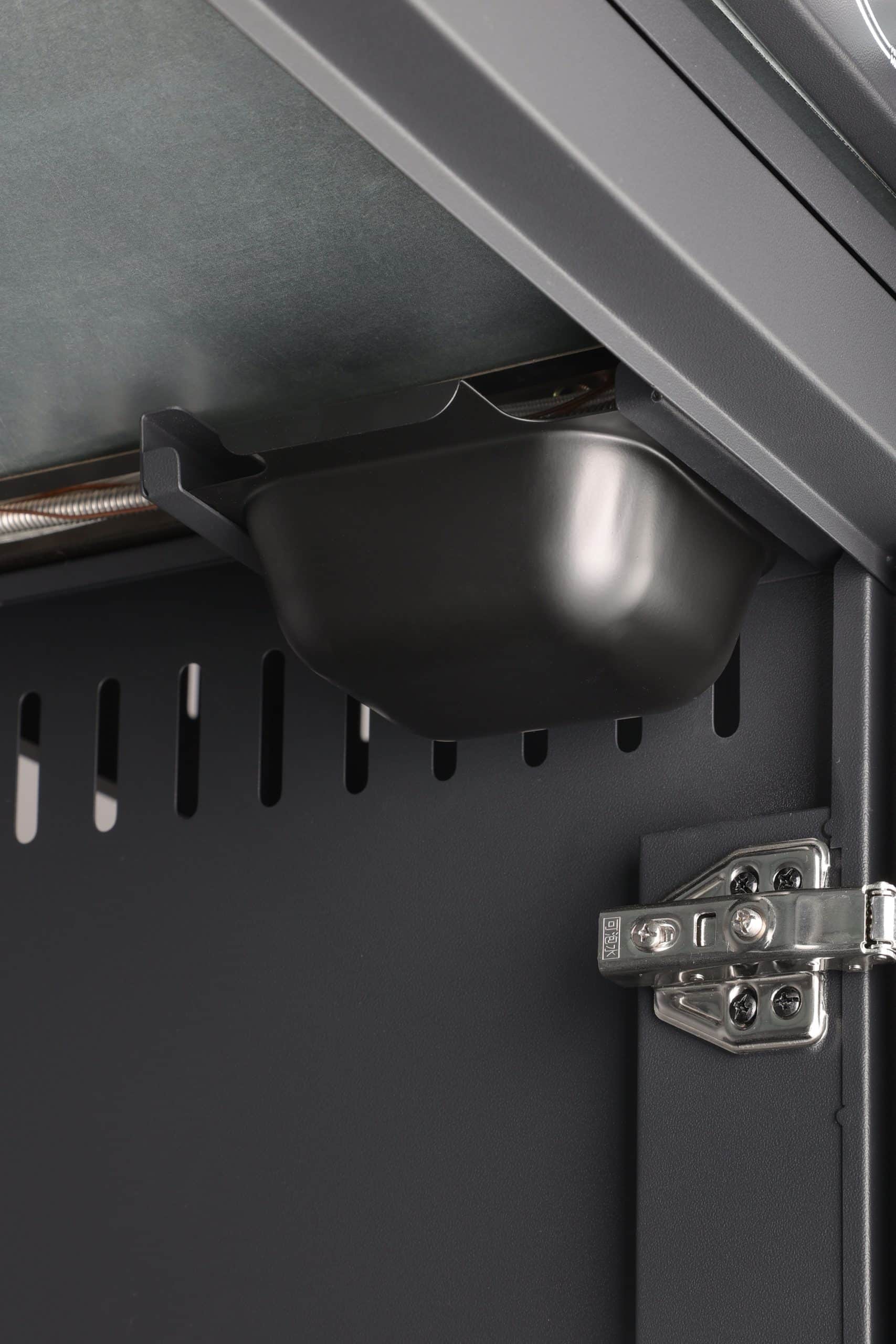 A kényelmet tovább növelik a puha záródású (soft-close) ajtókkal felszerelt tárolószekrény, mely tágas helyet kínál a gázpalack és a kiegészítők tárolására. A strapabíró görgők állítható lábakkal vannak ellátva, így biztosítva a könnyű mozgatást és a stabil pozíciót egyenetlen felületeken is.
